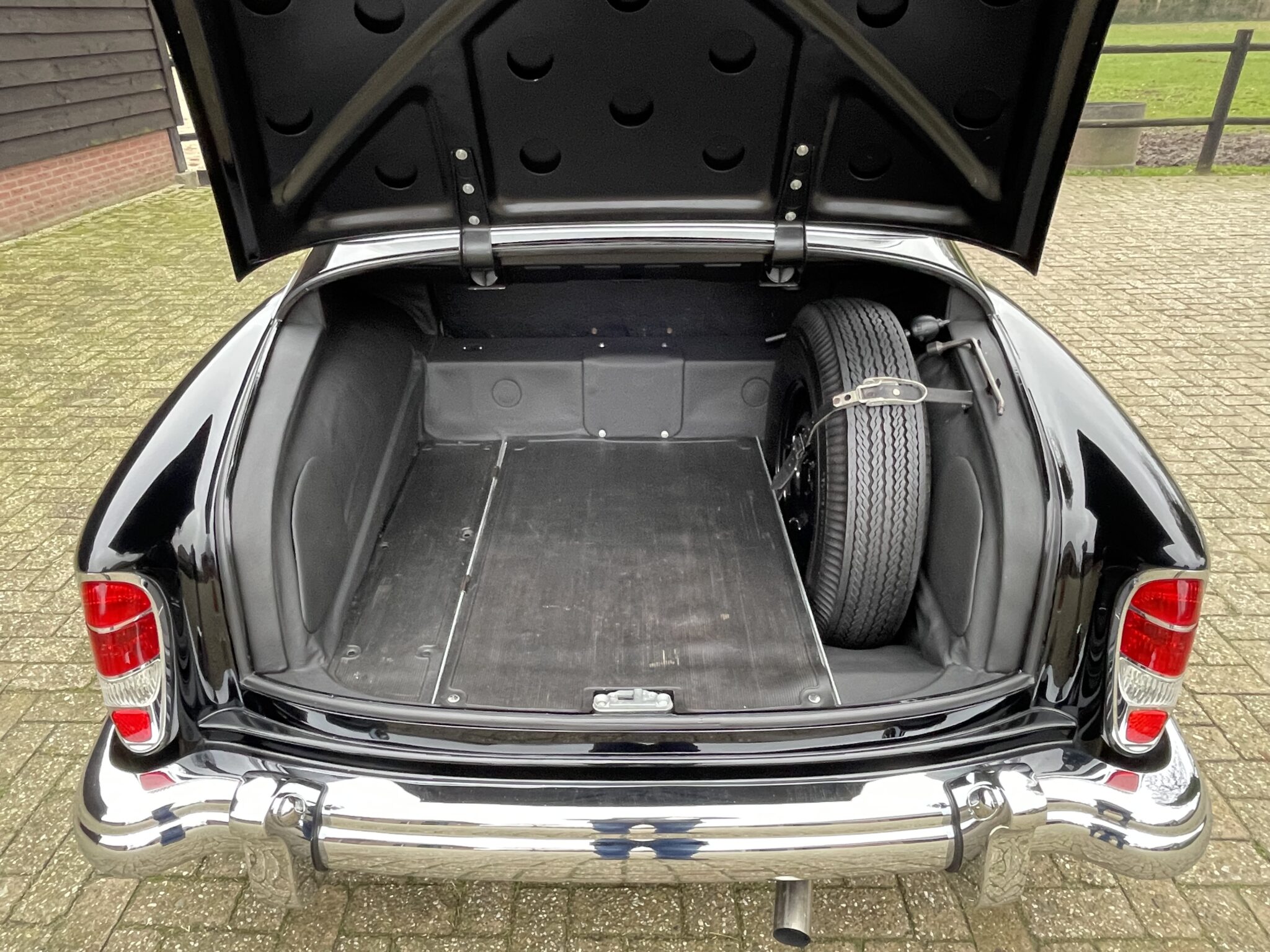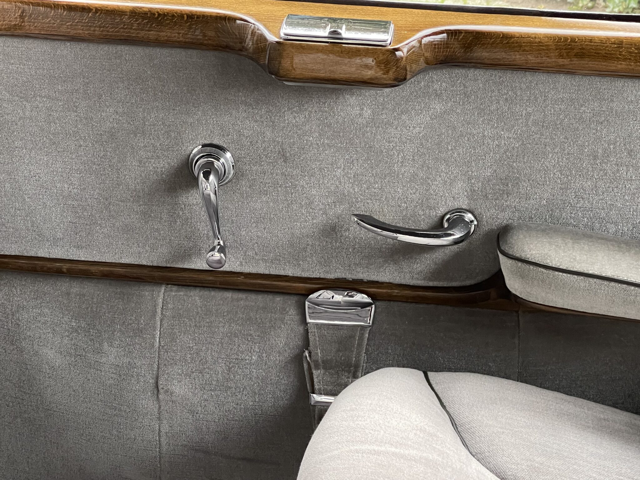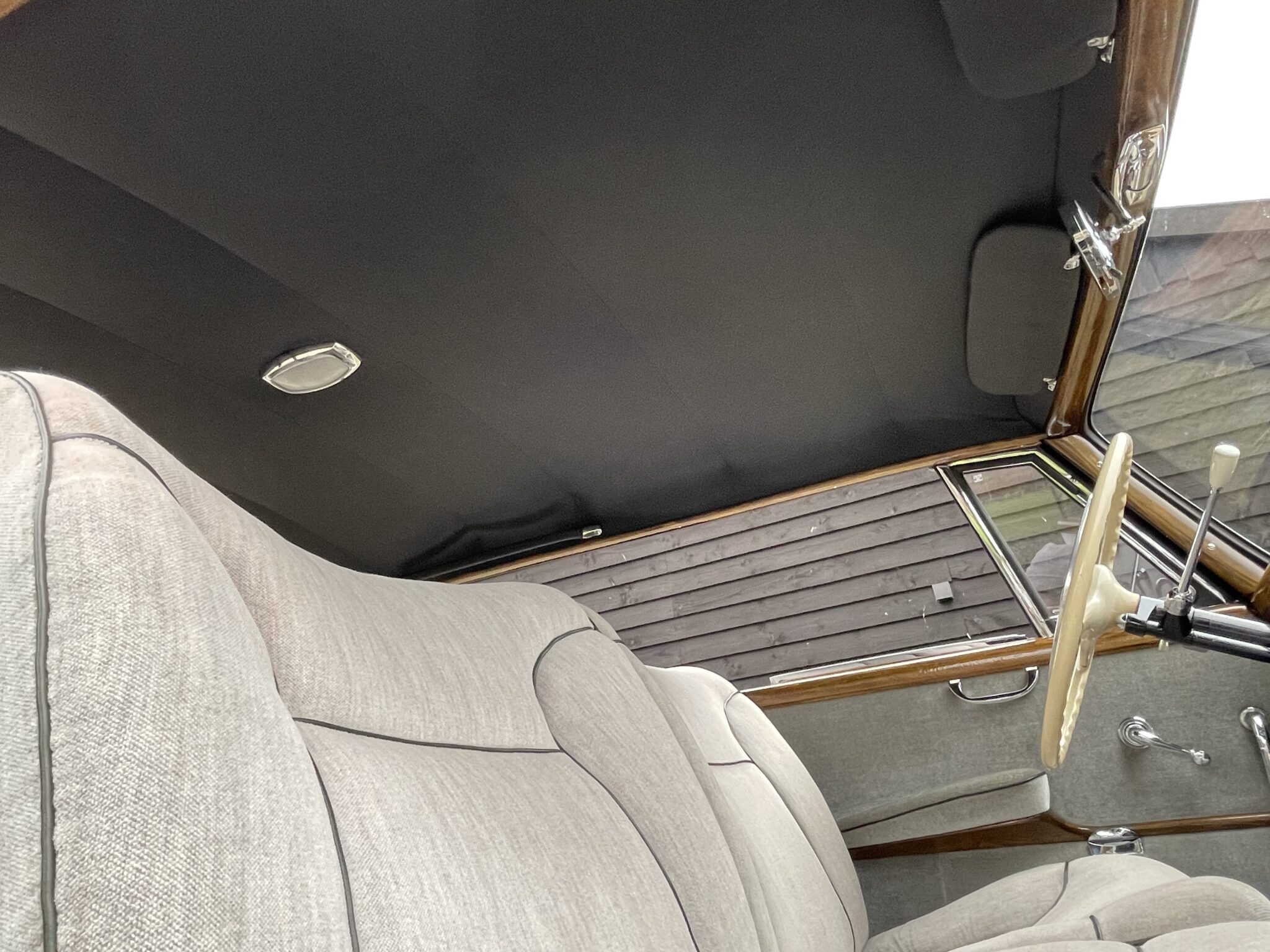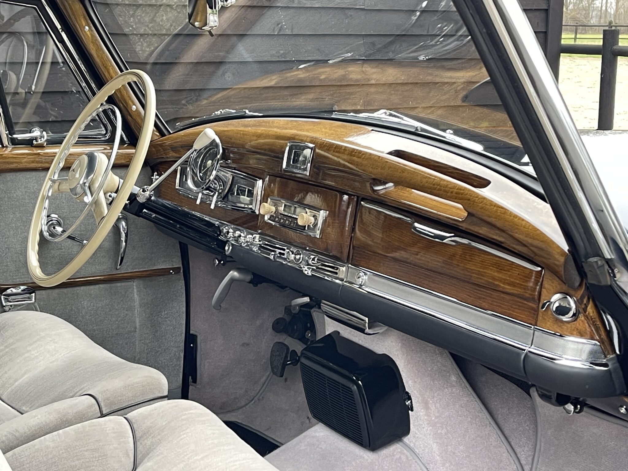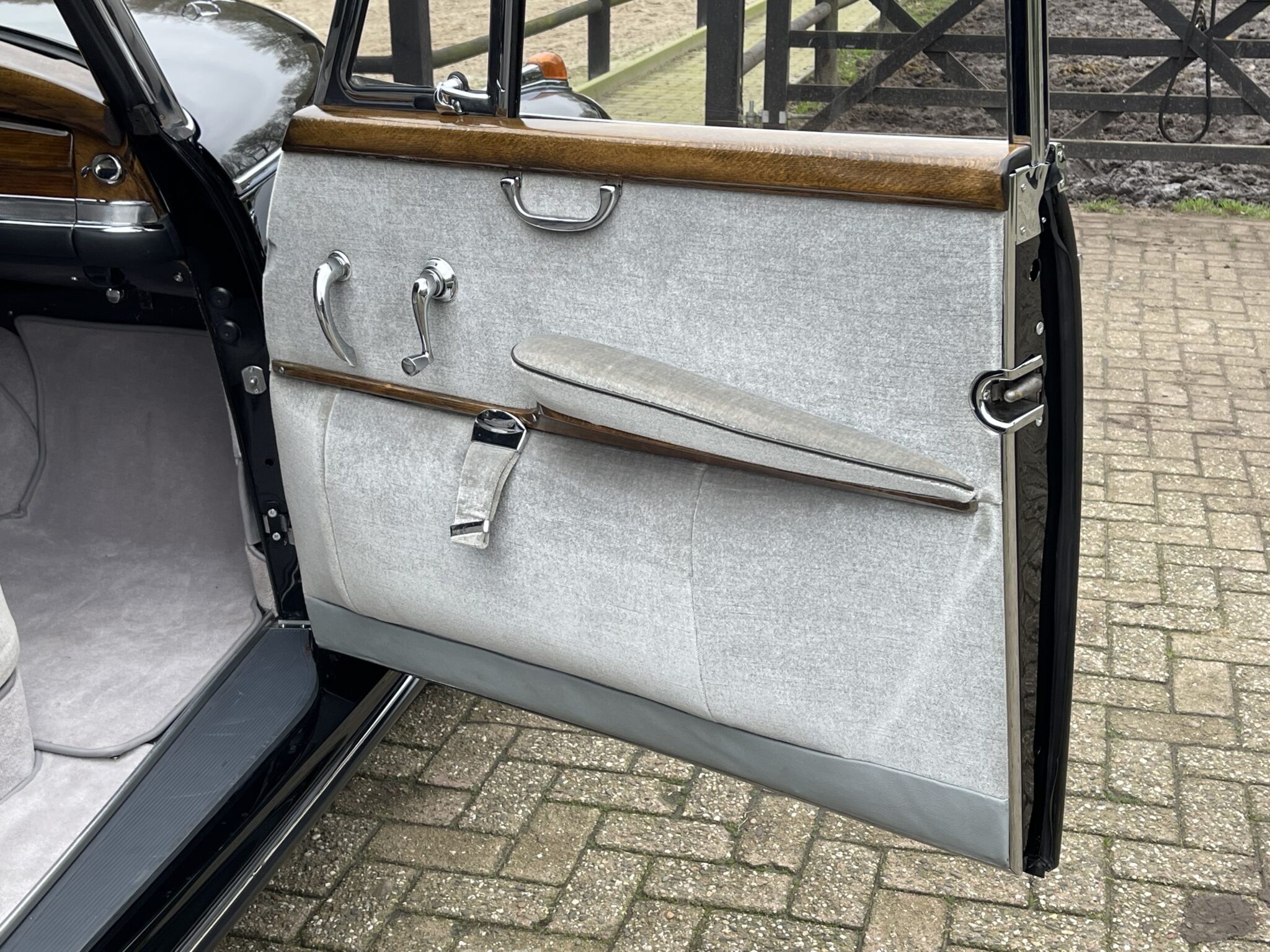Deze exclusieve klassieker heeft een prachtige kleuren combinatie; lakzwart koetswerk met een grijs velours Pulmann interieur afgewerkt met gelakt houten sierdelen en een ivoor kleurig stuur